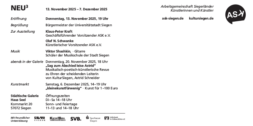 Einladung Ausstellung Neu3, Arbeitsgemeinschaft Siegerländer Künstlerinnen und Künstler, Nov. 2025